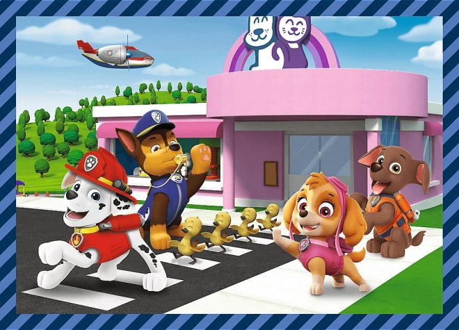 Odkryj zabawę z 4 oddzielnymi układankami z ulubionej bajki Psi Patrol. Każde opakowanie oferuje różną liczbę elementów dla dzieci w różnym wieku i na różnych poziomach umiejętności, największy obraz ma wymiary 28,5 × 20,5 cm. Puzzle zostały wyprodukowane w Polsce z użyciem ekologicznych materiałów.