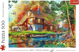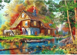 Odkryj urok wsi z puzzlami, które po ułożeniu tworzą obraz o wymiarach 480 × 340 mm. Ilustracja Dominica Davisona przedstawia sielską chatkę nad spokojnym strumykiem, otoczoną naturą – idealny motyw na chwile relaksu i koncentracji.