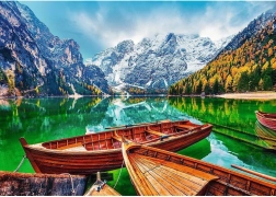 Detaliczną scenerię z łódkami na szmaragdowym jeziorze i ośnieżonymi szczytami tworzy harmonijny obraz, który pokochasz układać i eksponować.