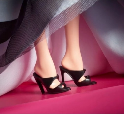 - Nosi czarno-białą sukienkę inspirowaną strojem kąpielowym pierwszej Barbie, z dopasowanym gorsetem w kształcie serca i szeroką, pasiastą spódnicą.