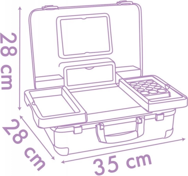 Walizka jest wyposażona w praktyczne lusterko, półki, przegródki i tajną przegródkę na bezpieczne przechowywanie ulubionych rzeczy. Dzięki kompaktowemu designowi jest łatwa do przenoszenia, co umożliwia zabawę we fryzjernię i makijaż w dowolnym miejscu.