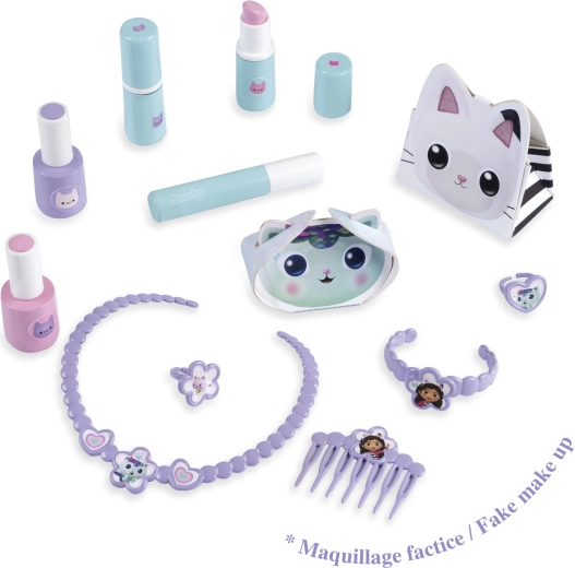 W komplecie „kosmetyczne” buteleczki, szminki, tusz do rzęs, grzebień, naszyjnik, bransoletka, pierścionki i więcej dla realistycznej zabawy.