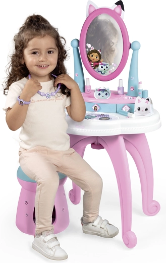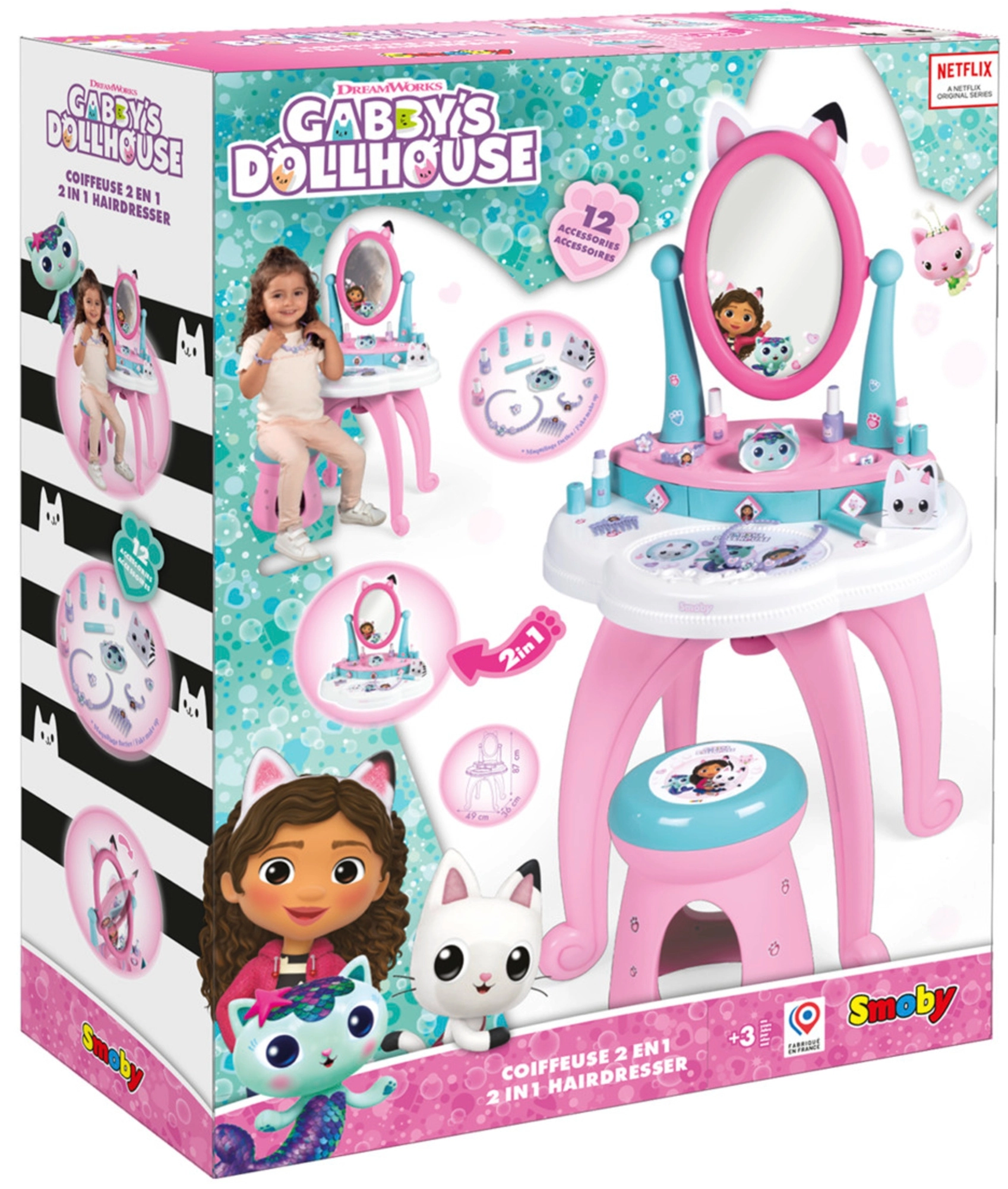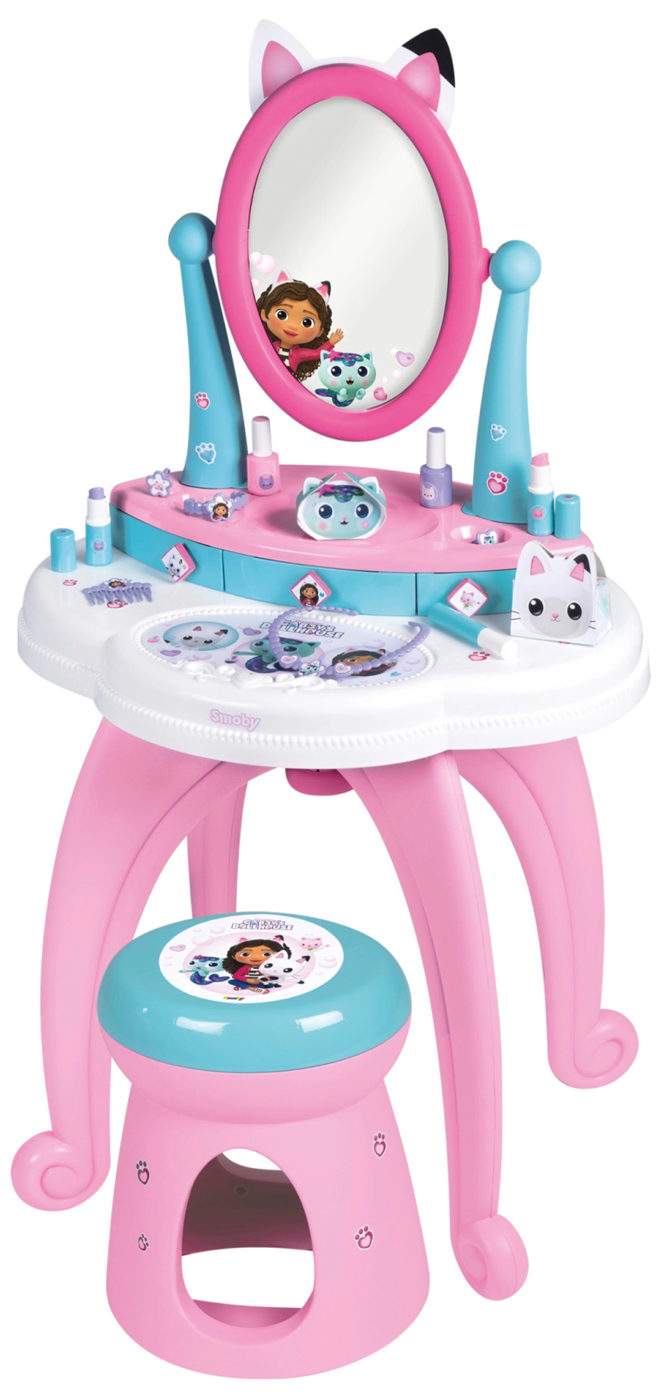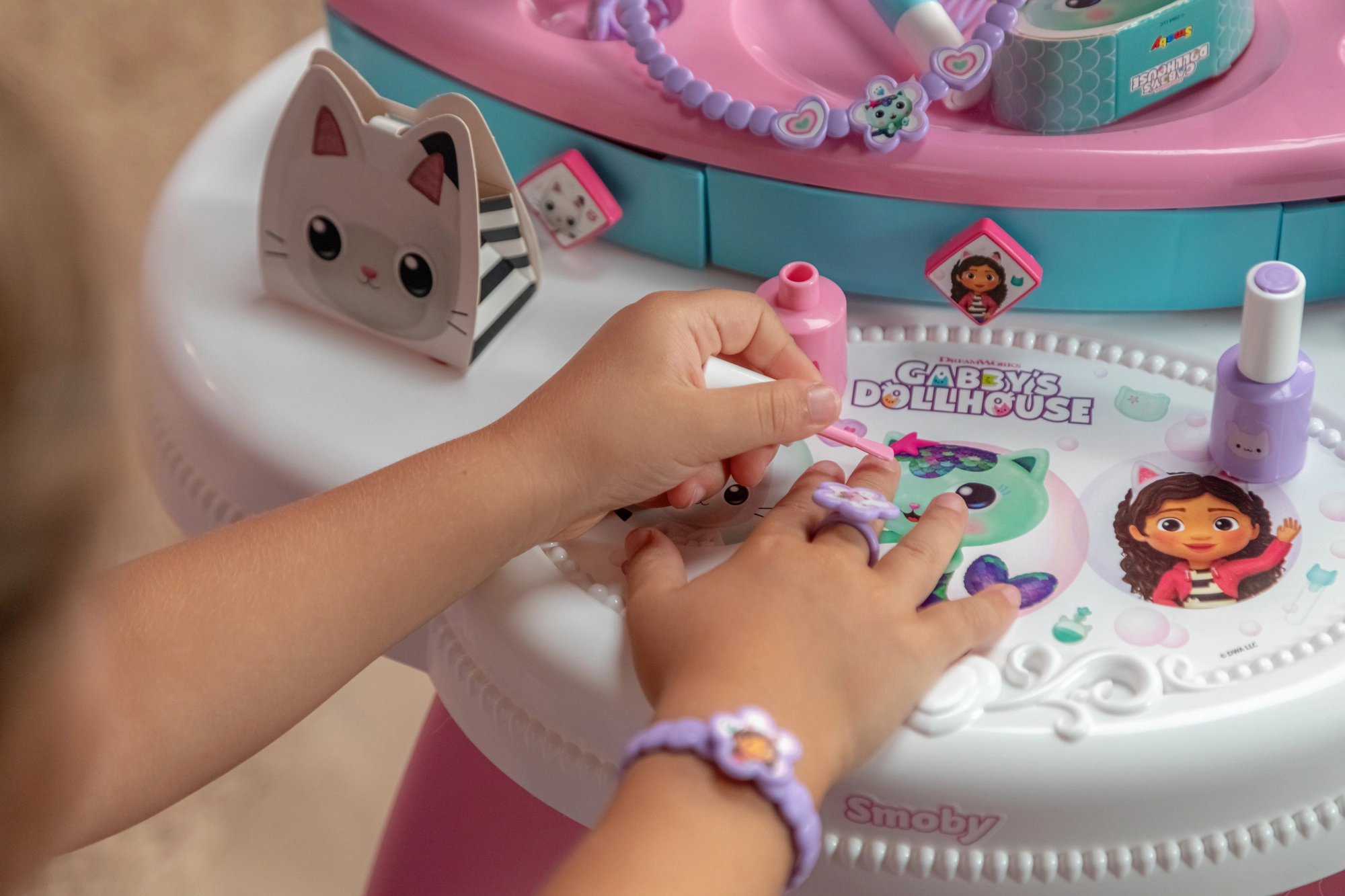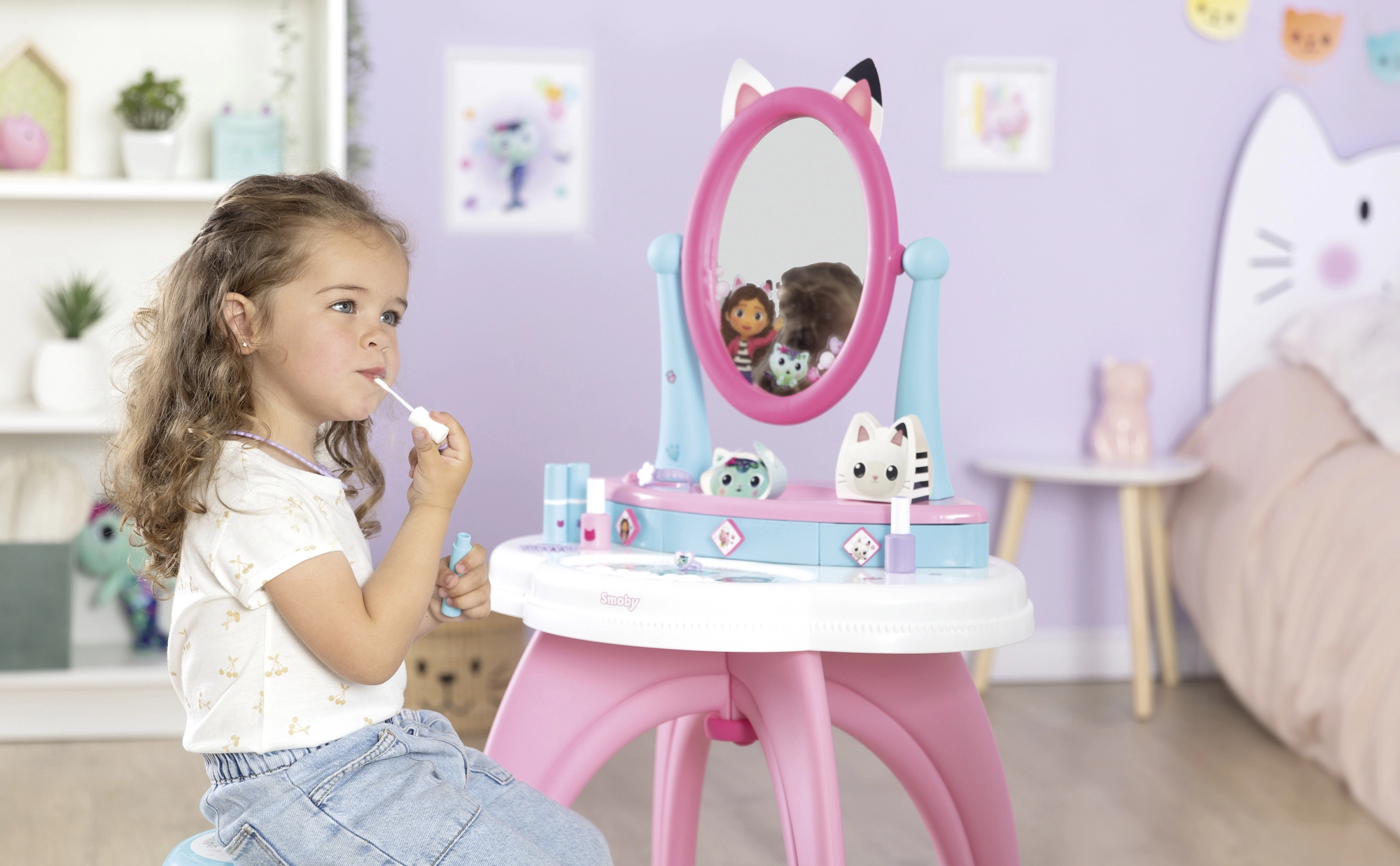 Toaletka dla dzieci inspirowana popularnym serialem GABBY’S DOLLHOUSE zamieni pokój w małe studio kosmetyczne. Dzięki dużemu regulowanemu lustru, trzem szufladom i bogatemu zestawowi akcesoriów wszystko jest pod ręką, a zabawa jest realistyczna i bezpieczna.
