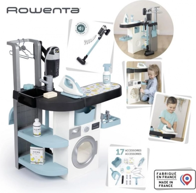 Dziecięca pralnia z żelazkiem i odkurzaczem Rowenta to doskonały wybór dla małych pomocników domowych. Zawiera cztery strefy zabawy: pralka, umywalka do prania ręcznego, część do suszenia oraz deska do prasowania, które uczą dzieci domowych obowiązków.