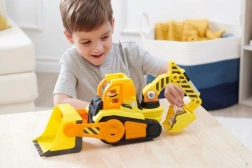 Ulubiony budowniczy rusza do pracy ze swoim buldożerem deluxe. Dzieci mogą posadzić figurkę w kabinie i jednym naciśnięciem uruchomić migające światła i realistyczne efekty dźwiękowe. Przednia łyżka i tylna koparka są w pełni ruchome, więc kopanie, nabieranie i załadunek to czysta frajda.