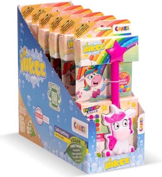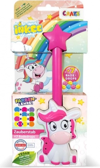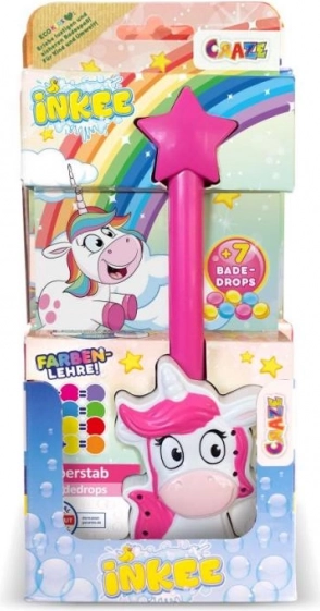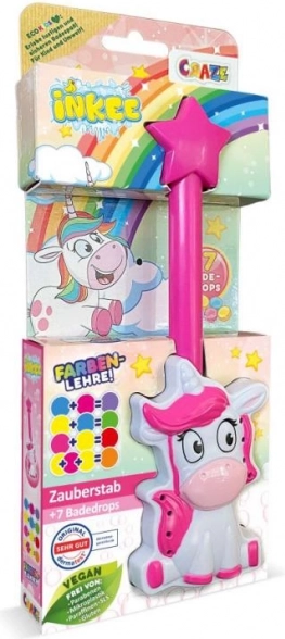 Magiczna różdżka INKEE w uroczym wzorze jednorożca przynosi dzieciom do wanny mnóstwo radości i wyobraźni. Wystarczy włożyć musującą kropelkę do różdżki, zanurzyć w wodzie i obserwować, jak uwalnia się kolorowy aromat truskawki i pozostaje magiczny ślad.