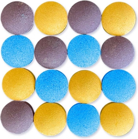 Cztery intensywne kolory (niebieski, różowy, fioletowy, żółty) przenikają się podczas rozpuszczania, zamieniając kąpiel w radosny, kolorowy spektakl.