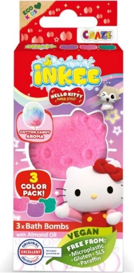 Odkryj magię kąpieli z mini zestawem Inkee Hello Kitty. Trzy małe musujące kule (3×15 g) zamienią wodę w radosną, kolorową kąpiel z delikatnym zapachem waty cukrowej. Stylowe opakowanie z okienkiem ucieszy dzieci i fanów HELLO KITTY, świetnie nadaje się też na mały prezent.