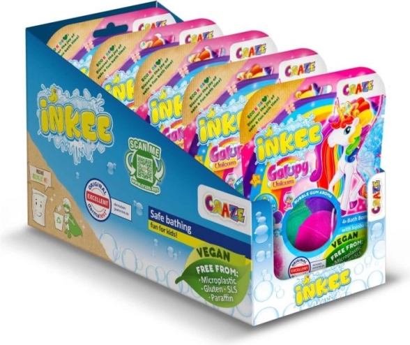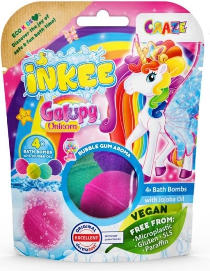 Wnieś do dziecięcej kąpieli radość i kolory z INKEE Galupy Unicorn. Każda kula delikatnie musuje w wodzie, uwalniając wesołe barwy i słodki zapach gumy balonowej, a olej jojoba pomaga utrzymać skórę miękką.