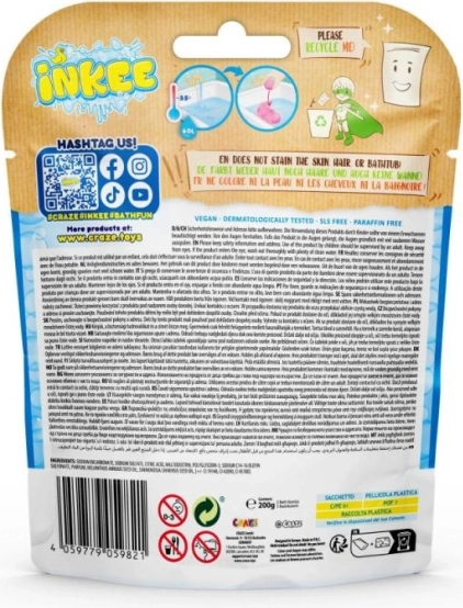 Produkty INKEE są tworzone z myślą o dzieciach i naturze – są wegańskie, bez mikroplastiku, bez SLS, bez parafiny i odpowiednie dla dzieci od 3 lat. Pakowane w praktyczny woreczek z okienkiem ułatwiającym wybór koloru.
