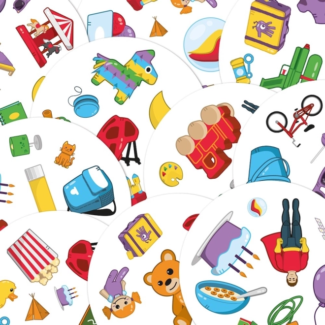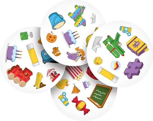 Dobble Kids to gra, która trenuje spostrzegawczość i szybkość reakcji, w pełni dostosowana do potrzeb najmłodszych dzieci. Zestaw zawiera 55 kart z symbolami przedstawiającymi przedmioty i zabawki, którymi dzieci bawią się na co dzień. Miś, plecak, piłka, rower, lalka – proste obrazki łatwiej nazwać, dlatego do gry możemy zaprosić dzieci już od 4 lat.