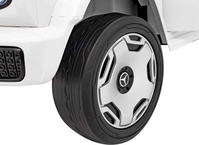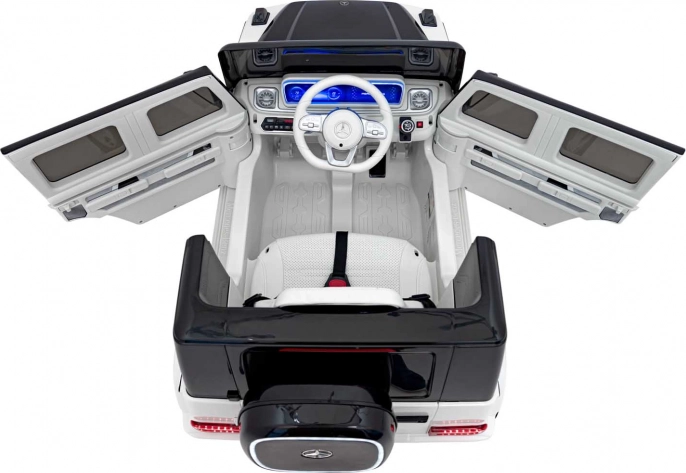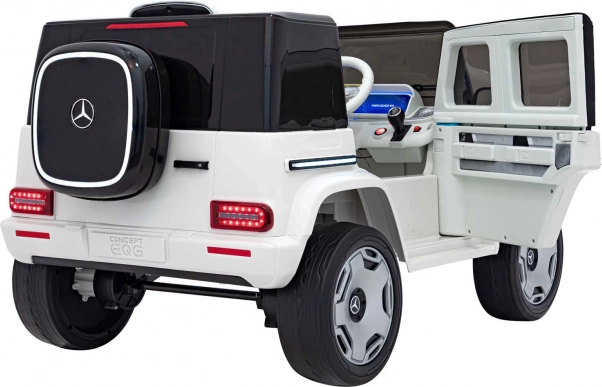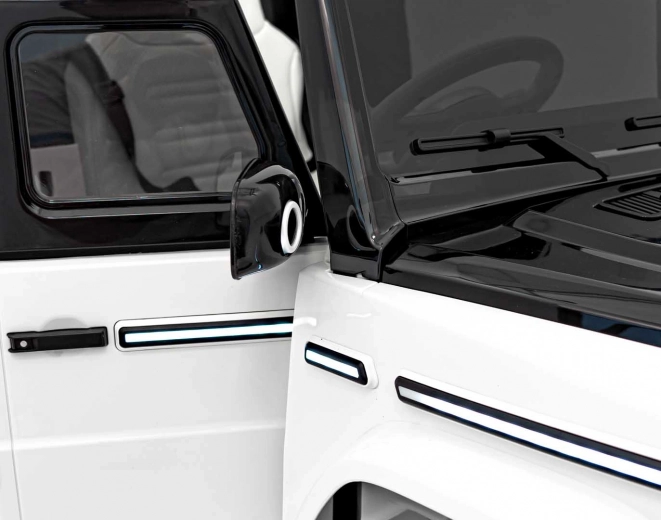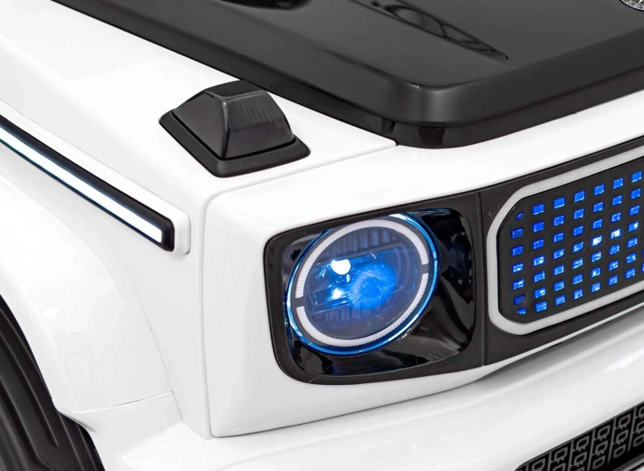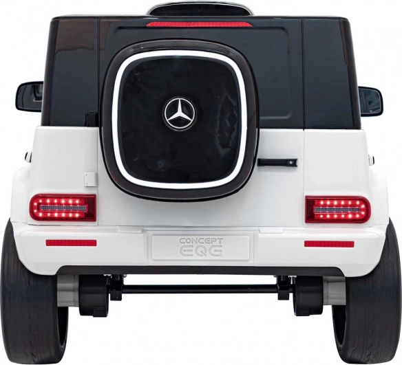 Stylowy dziecięcy elektryczny samochodzik MERCEDES‑BENZ EQG w białym kolorze oferuje realistyczny design SUV‑a, mocny napęd 2×20 W + 2×45 W, akumulator 12 V 9 Ah oraz wygodne siedzenie z ekoskóry z pasami bezpieczeństwa. Dzięki pilotowi 2,4 GHz z trzema prędkościami i funkcją STOP masz zawsze pełną kontrolę nad jazdą dziecka. Miękkie koła EVA, tylne amortyzatory, światła LED z przodu i z tyłu oraz boczne podświetlenie karoserii dbają o bezpieczeństwo, komfort i efektowny wygląd.