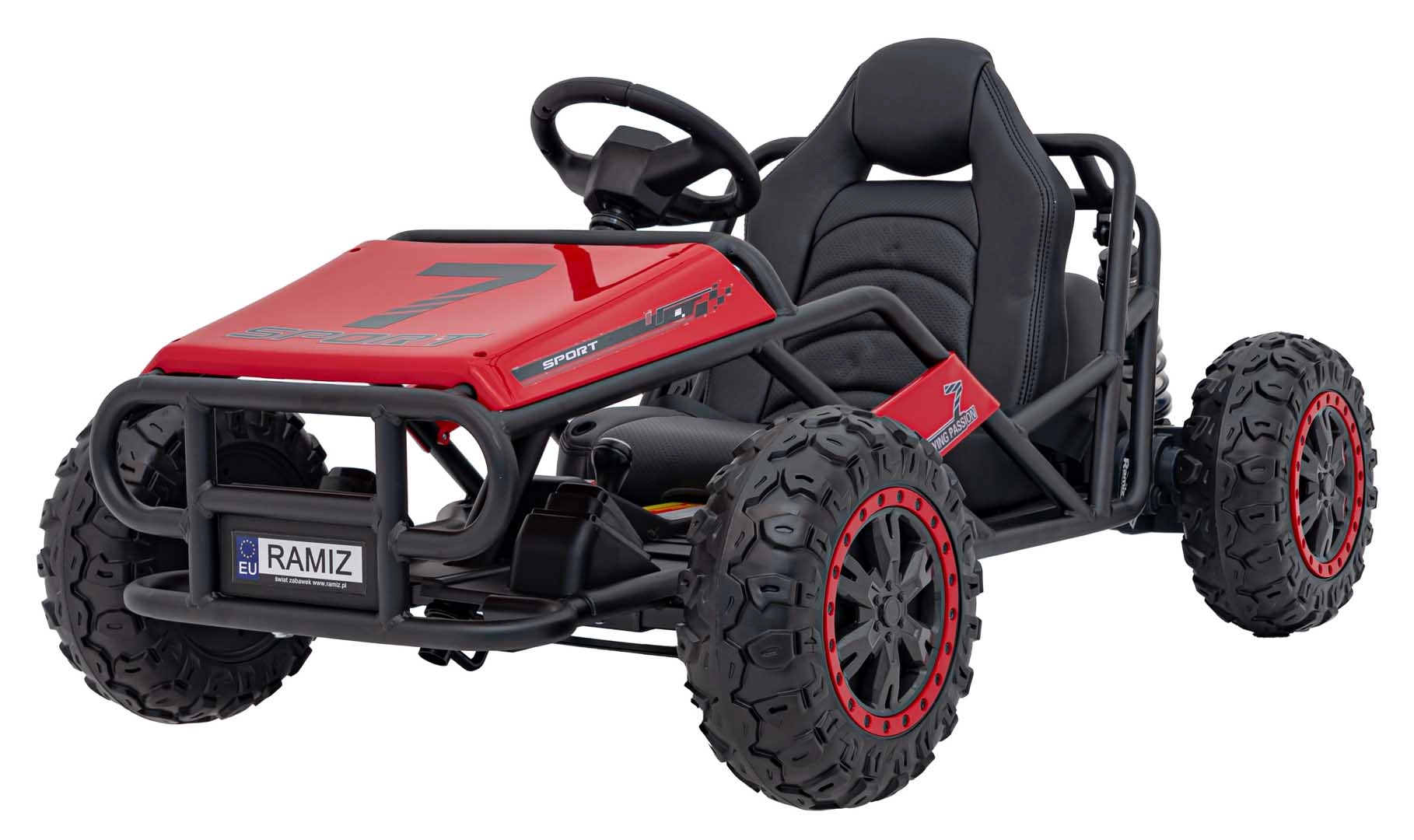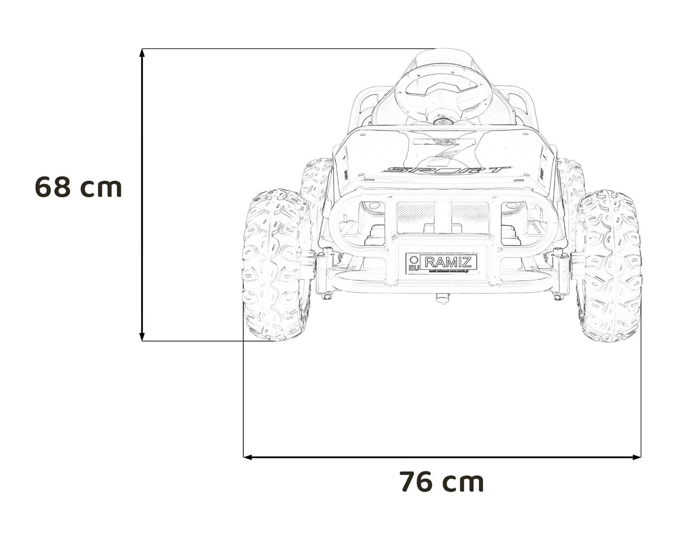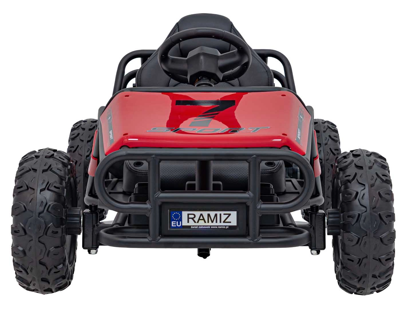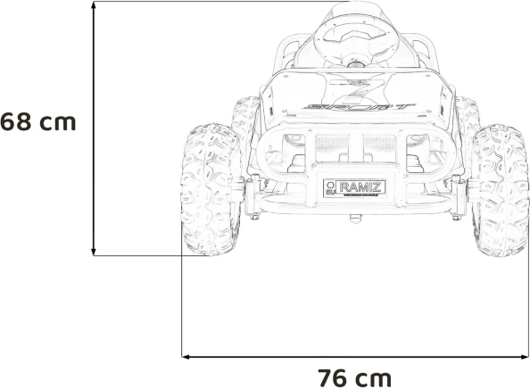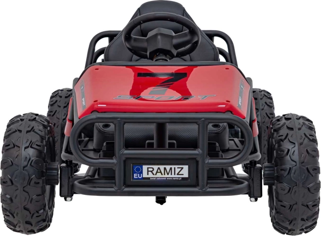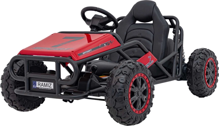 Sportowy dziecięcy gokart RAMIZ jest stworzony do przygód w ogrodzie i na nieutwardzonych ścieżkach. Dwa mocne silniki 2×100 W zasilane akumulatorem 24V 10Ah zapewniają pewny ciąg, płynny start i możliwość wyboru dwóch prędkości. Duże koła EVA 29×11 cm świetnie tłumią nierówności, tylne podwójne amortyzatory zwiększają stabilność, a prześwit 15 cm pozwala gładko pokonywać przeszkody.