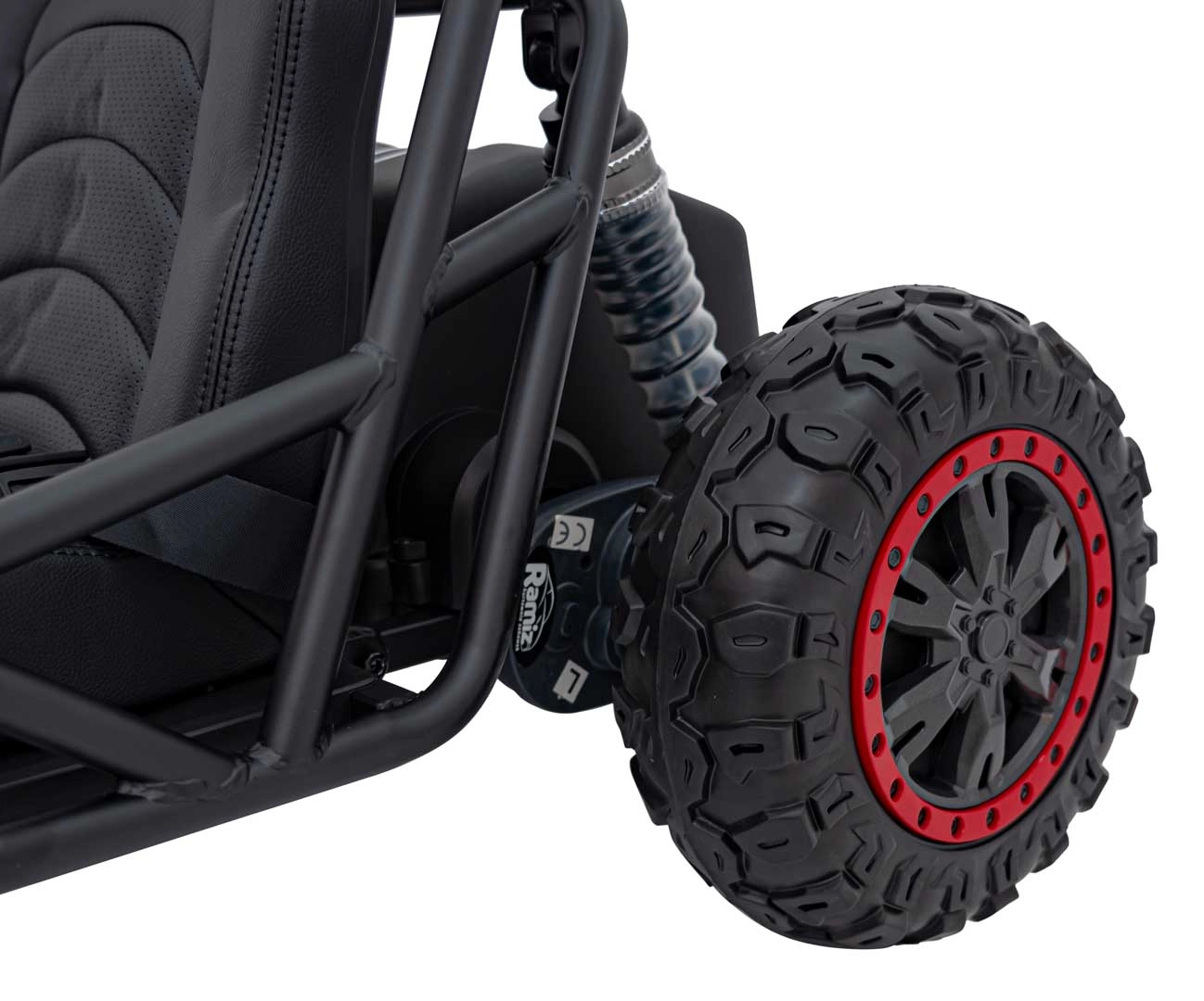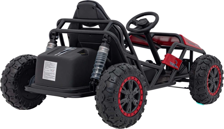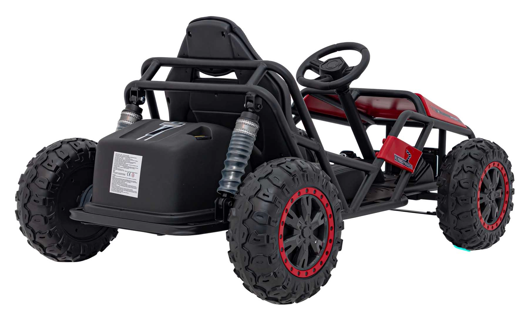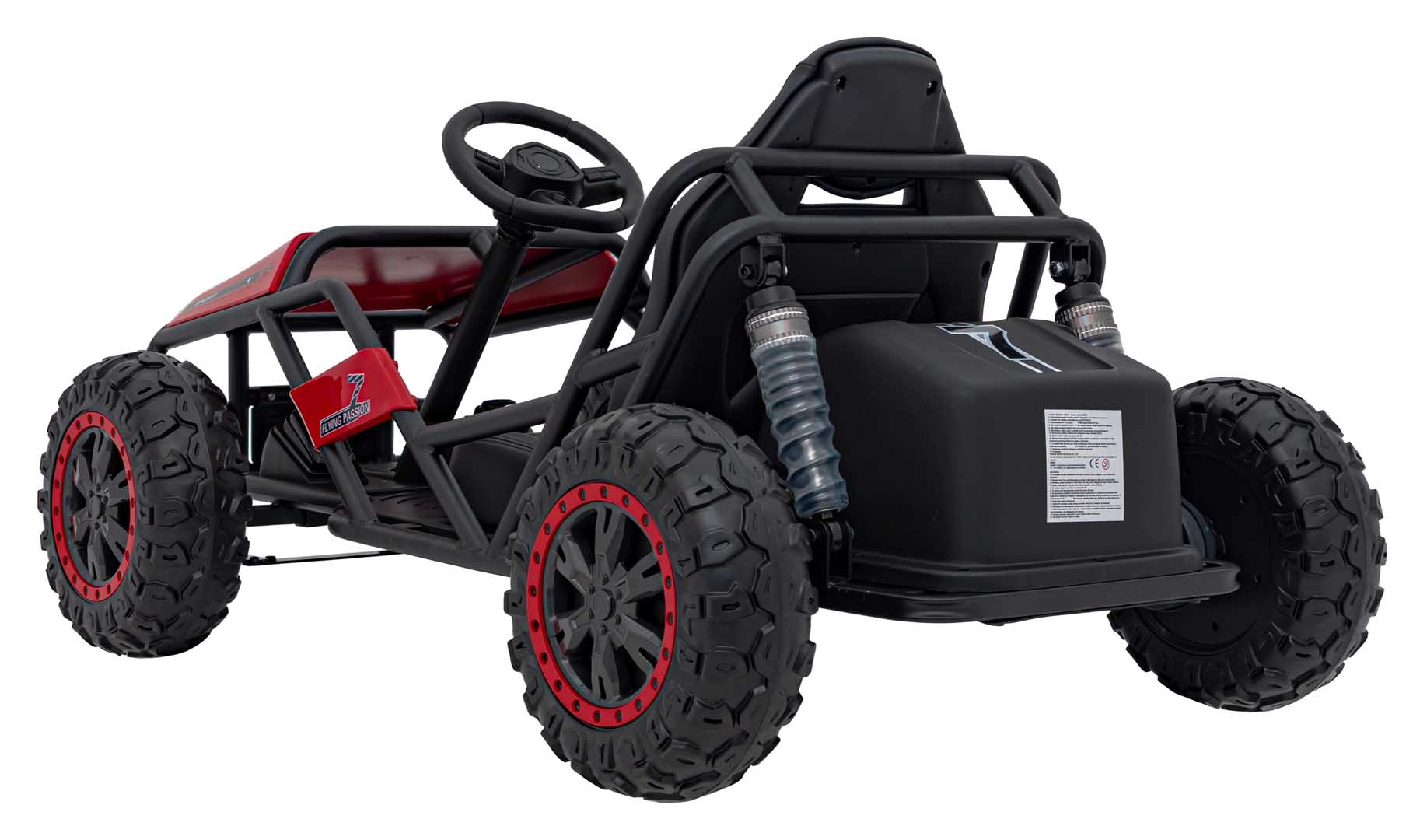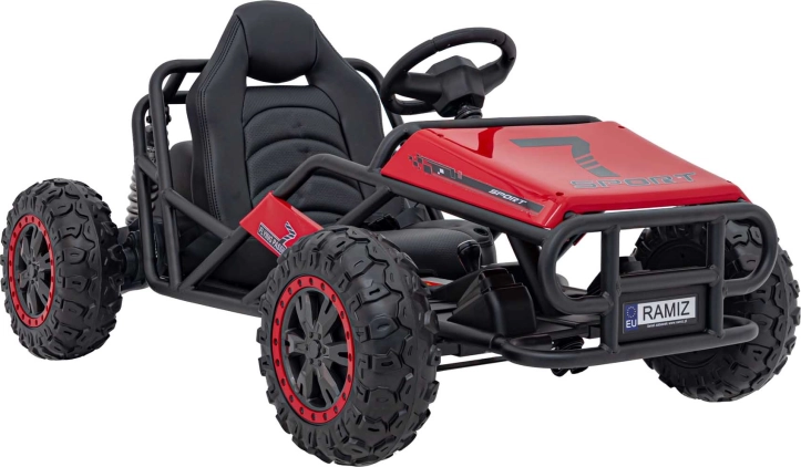 Sportowy dziecięcy gokart RAMIZ jest stworzony do przygód w ogrodzie i na nieutwardzonych ścieżkach. Dwa mocne silniki 2×100 W zasilane akumulatorem 24V 10Ah zapewniają pewny ciąg, płynny start i możliwość wyboru dwóch prędkości. Duże koła EVA 29×11 cm świetnie tłumią nierówności, tylne podwójne amortyzatory zwiększają stabilność, a prześwit 15 cm pozwala gładko pokonywać przeszkody.