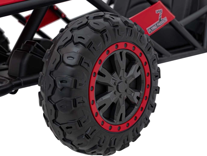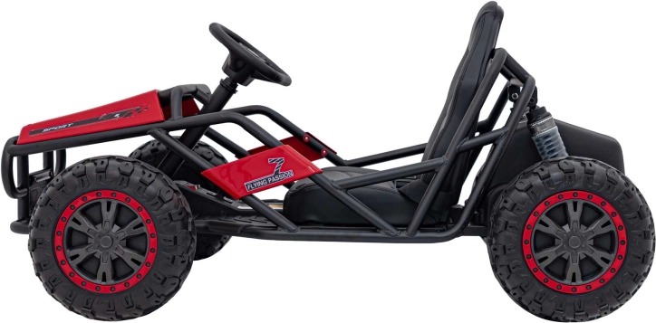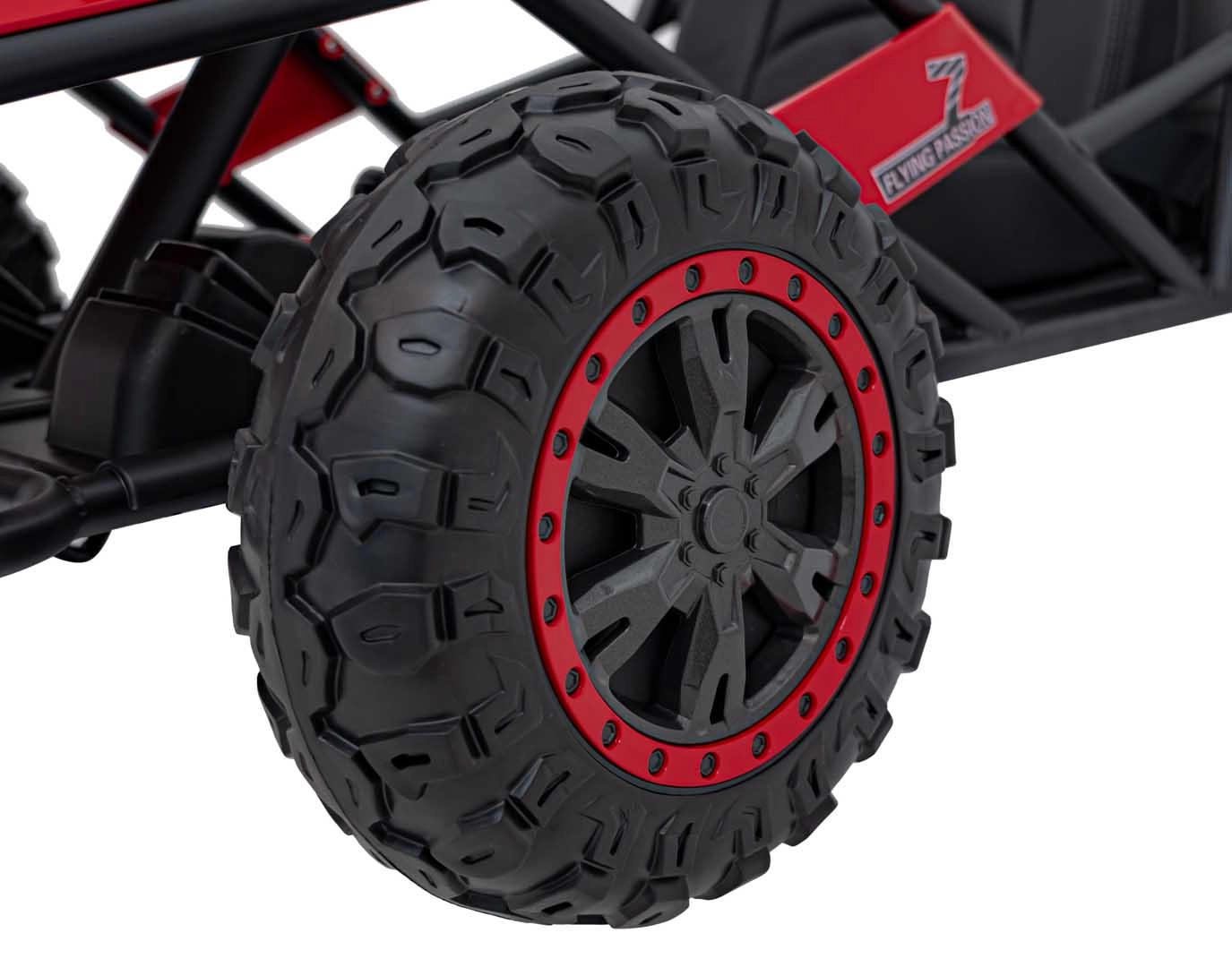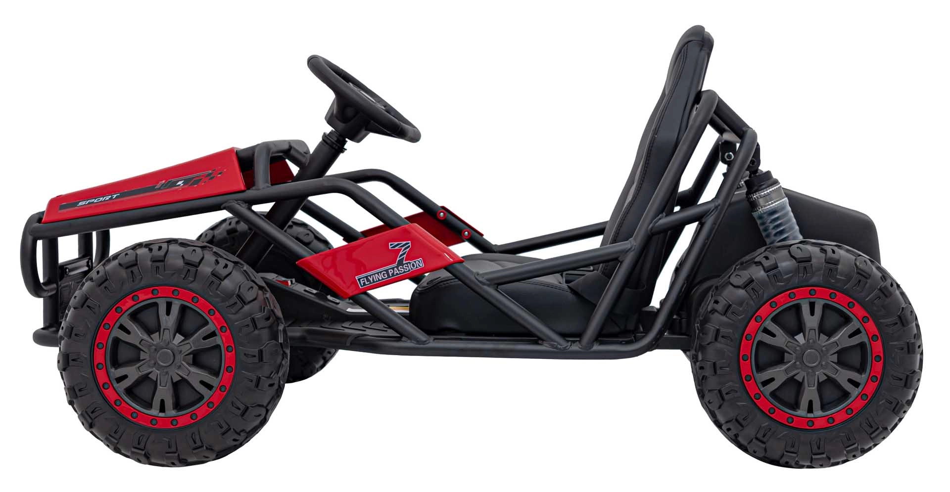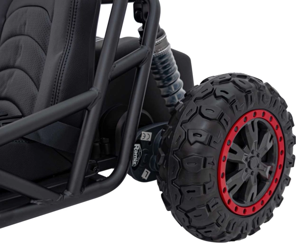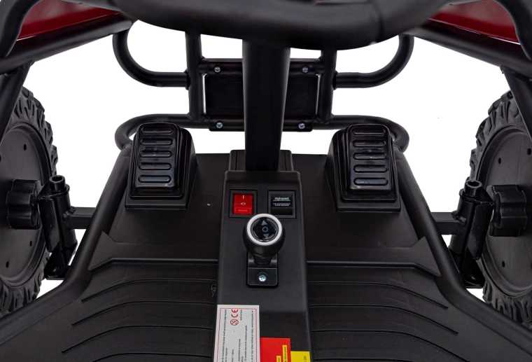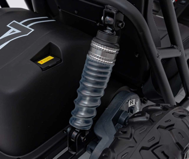 Sportowy dziecięcy gokart RAMIZ jest stworzony do przygód w ogrodzie i na nieutwardzonych ścieżkach. Dwa mocne silniki 2×100 W zasilane akumulatorem 24V 10Ah zapewniają pewny ciąg, płynny start i możliwość wyboru dwóch prędkości. Duże koła EVA 29×11 cm świetnie tłumią nierówności, tylne podwójne amortyzatory zwiększają stabilność, a prześwit 15 cm pozwala gładko pokonywać przeszkody.