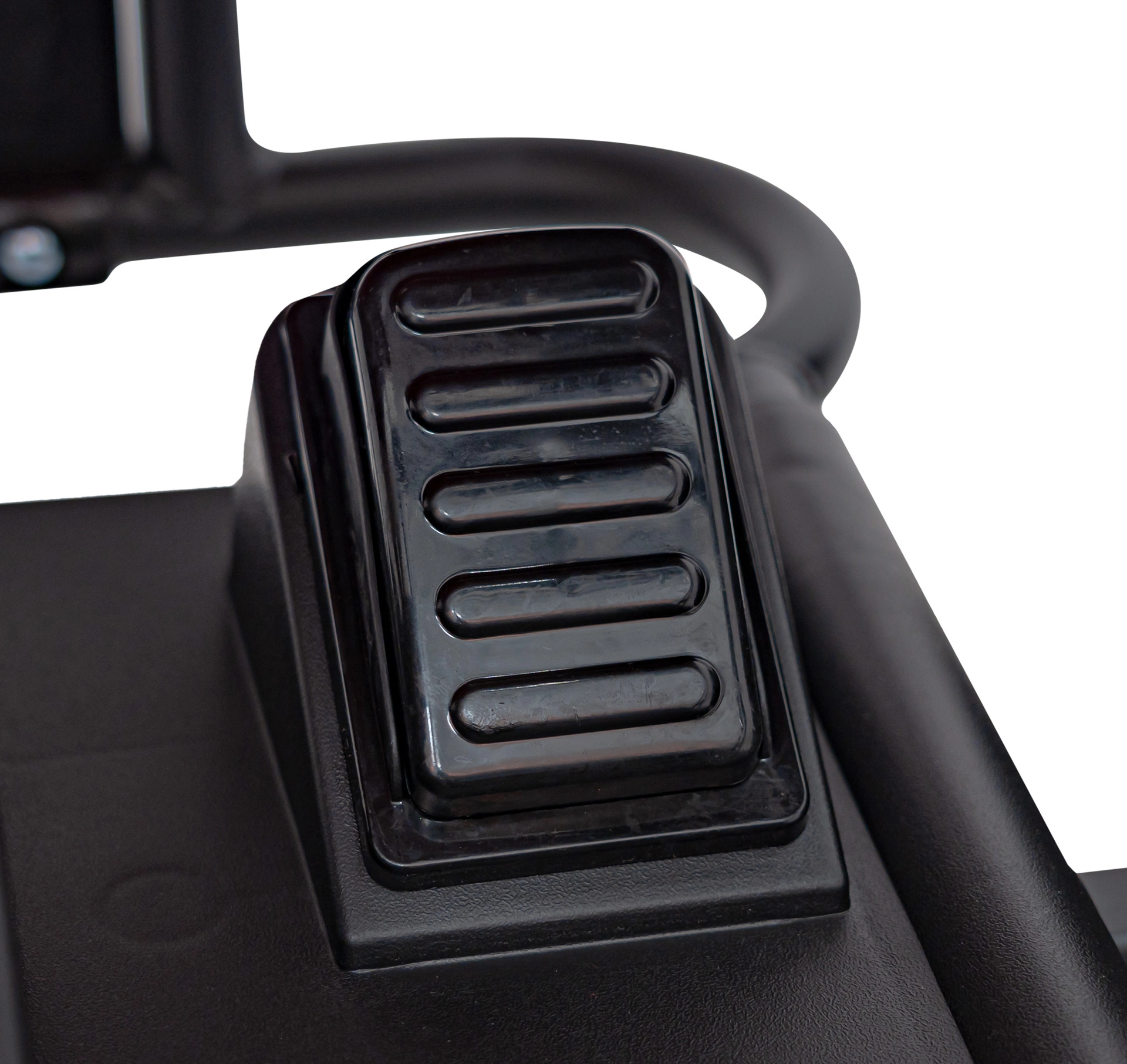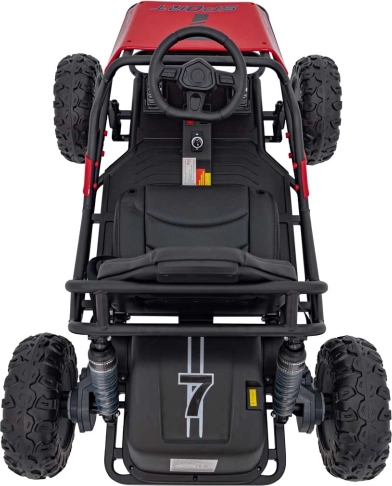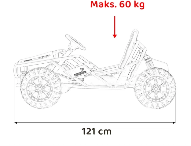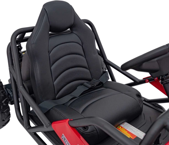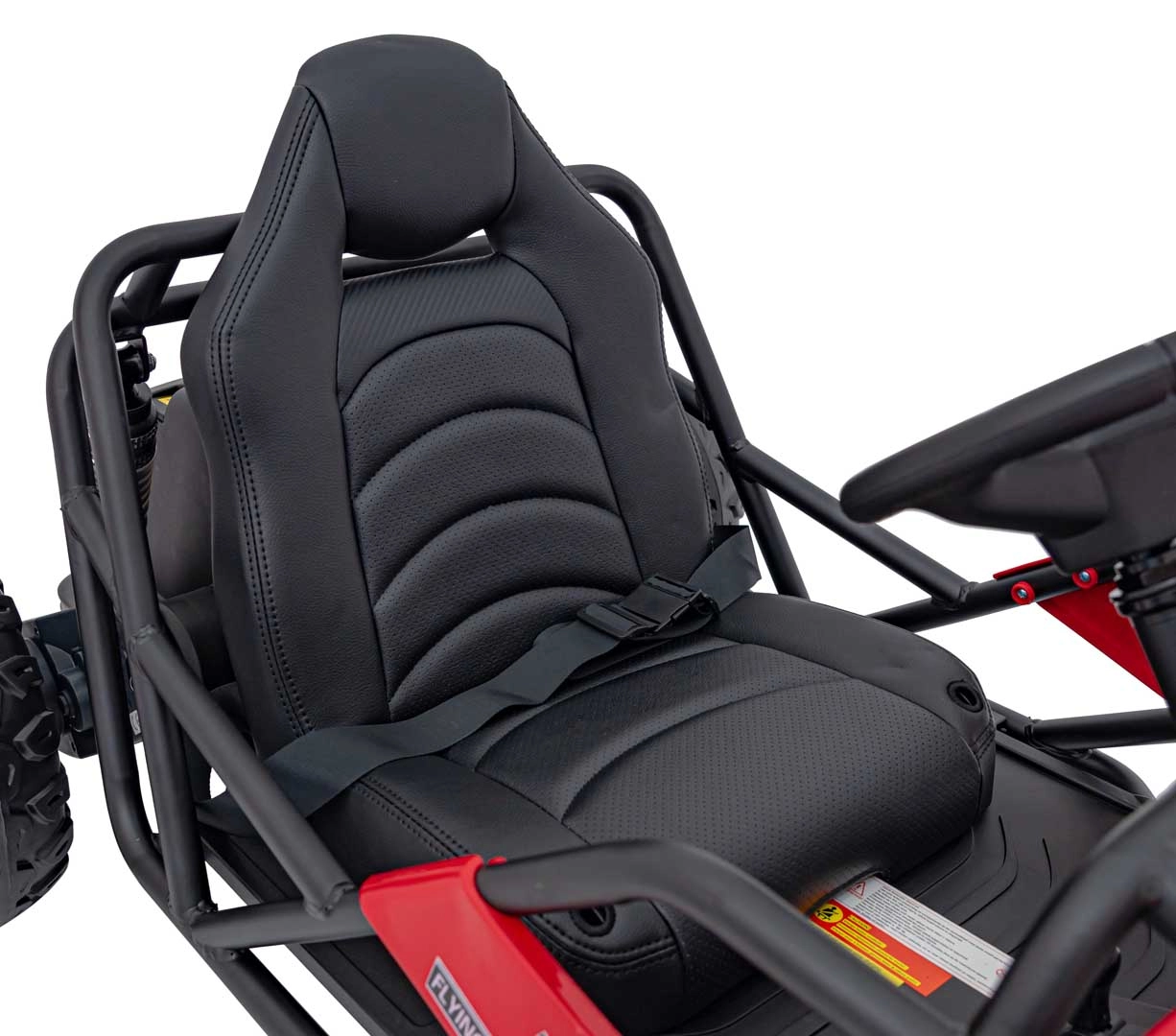 Ergonomiczne siedzisko z ekoskóry (38 × 28 × 45 cm) z pasami bezpieczeństwa utrzymuje dziecko wygodnie i bezpiecznie. Sterowanie jest intuicyjne – jazda do przodu/tyłu i płynny pedał ułatwiają opanowanie pierwszych przejażdżek. Konstrukcja jest przewidziana na obciążenie do 60 kg, więc gokart będzie „rósł” razem z dzieckiem.