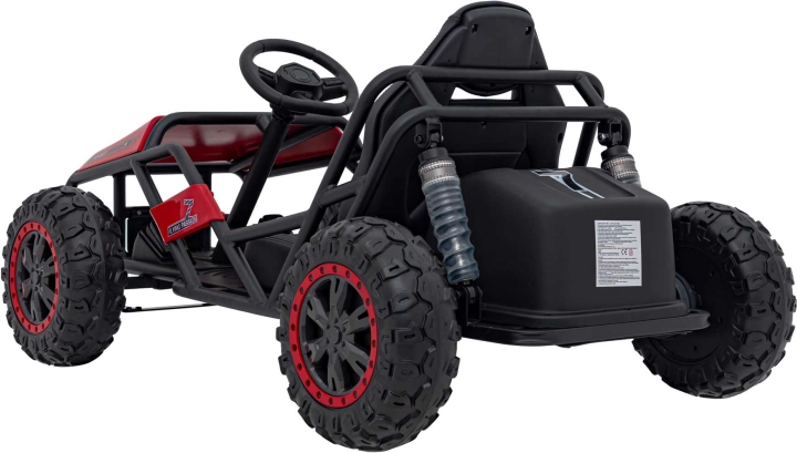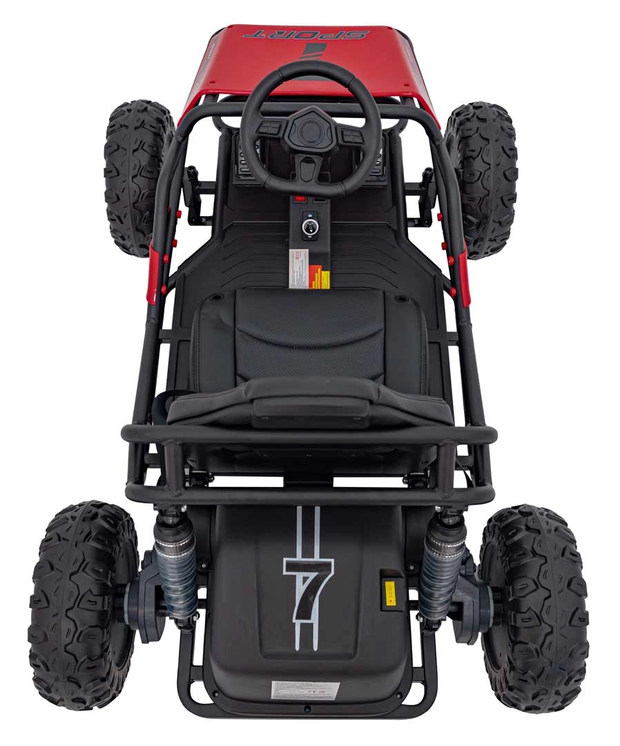 Wytrzymała dziecięca gokart z napędem 2x100 W i akumulatorem 24V 10Ah oferuje płynny start, dwa biegi oraz jazdę do przodu/tyłu. Duże koła EVA 29×11 cm, tylne podwójne amortyzatory i prześwit 15 cm zapewniają stabilność w terenie. Komfort zwiększają szerokość siedziska 38 cm, ekoskóra i pasy bezpieczeństwa. Maksymalne obciążenie to 60 kg.
