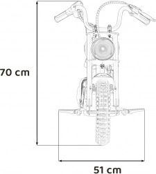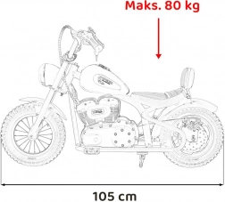 Stylowy dziecięcy motocykl o realistycznym wyglądzie i wydajnym napędzie zapewni dzieciom godziny zabawy oraz rozwój koordynacji. Wyposażony w bezobsługowy silnik bezszczotkowy 250 W, akumulator 24 V / 7 Ah, pompowane koła 33 × 8 cm, przednią lampę LED oraz miękkie siedzisko z ekoskóry. Bezpieczny płynny start, dzwonek i wskaźnik naładowania zwiększają komfort i bezpieczeństwo jazdy.