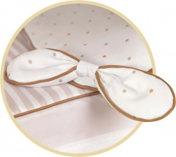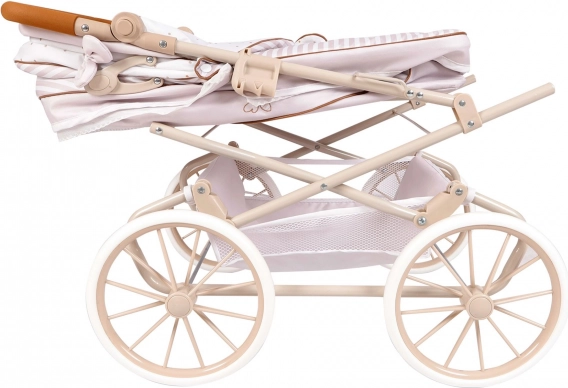 Praktyczne detale, takie jak składana budka, kosz na akcesoria, sprężynowe kołysanie i odpinana osłona gondoli, zapewniają wygodę podczas każdego spaceru z lalką. Bogate wyposażenie obejmuje parasolkę (Ø 50 cm), materacyk i kołderkę oraz ozdobną torbę dopasowaną do kolekcji.