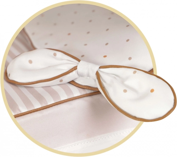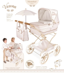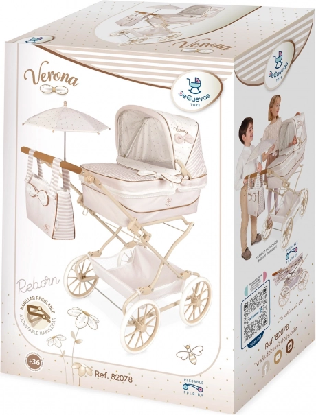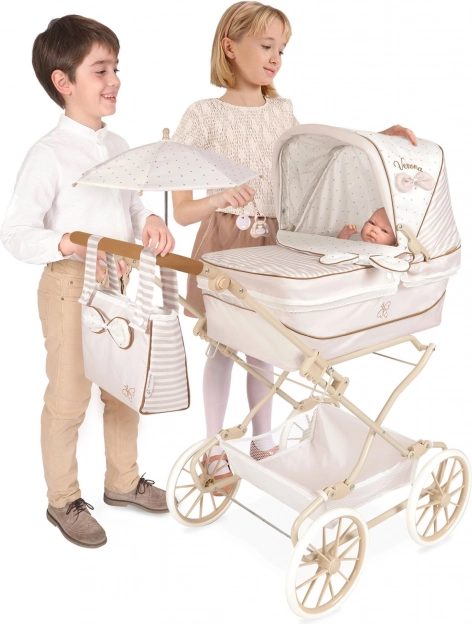 Czarujący wózek dla lalek REBORN Verona 2024 w połączeniu jasnego beżu i bieli z delikatnymi kropeczkami i paskami zachwyca precyzyjnym hiszpańskim wykonaniem oraz ponadczasowym wzornictwem. Dzięki regulowanej rączce (65–90 cm) doskonale dopasowuje się do wzrostu dziecka i jest łatwy w prowadzeniu.