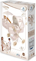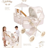 Elegancki składany wózek dla lalek z kolekcji Verona w delikatnych, naturalnych kolorach oferuje dzieciom realistyczną zabawę w rodziców. Ma składaną budkę, parasolkę, odpinaną torbę oraz kosz na akcesoria. Dzięki lekkiej ramie i wysokości rączki 60 cm doskonale sprawdzi się także dla młodszych dzieci. Wysokiej jakości hiszpański design i precyzyjne wykonanie gwarantują długą trwałość.