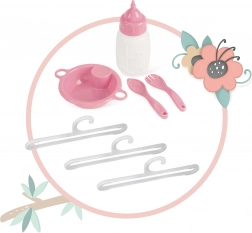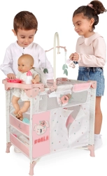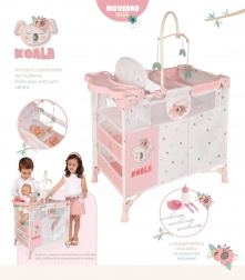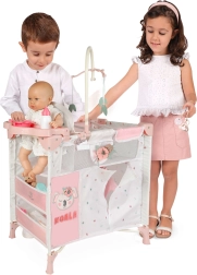 Zestaw zawiera wszystko do pełnej opieki: łóżeczko z przezroczystym siateczkowym okienkiem, karuzelę z listkami, przewijak, krzesełko do karmienia z plastikowym zestawem (butelka, miseczka, sztućce) oraz dużą szafkę na zamek z drążkiem i 3 wieszakami. Dzięki kompaktowemu wykonaniu cały zestaw jest łatwy w obsłudze, a po zabawie szybko go uporządkujesz.