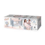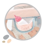 Łóżeczko składa się błyskawicznie do małego pakunku, więc nie zajmuje miejsca, a dzieci łatwo zabiorą je wszędzie. Praktyczna boczna kieszeń pomieści buteleczkę, smoczek lub inne niezbędne drobiazgi dla lalki – zawsze pod ręką.