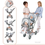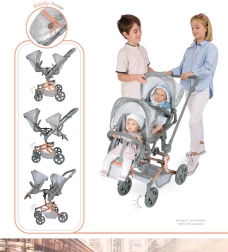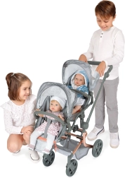 Wózek to świetny wybór dla przedszkolaków: dwie oddzielne gondole można ustawić przodem lub tyłem do kierunku jazdy, lalki zabezpieczysz trzypunktowymi pasami, a przezroczyste kieszenie na zamek dopilnują drobiazgów. Regulowana wysokość rączki (61–91 cm) rośnie razem z dzieckiem, a obrotowe przednie kółka zapewniają płynną jazdę.