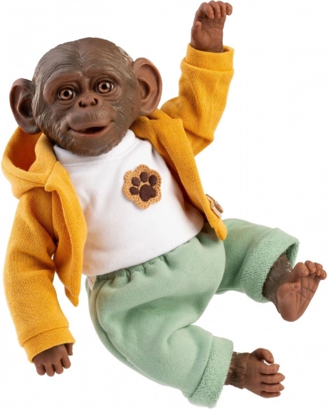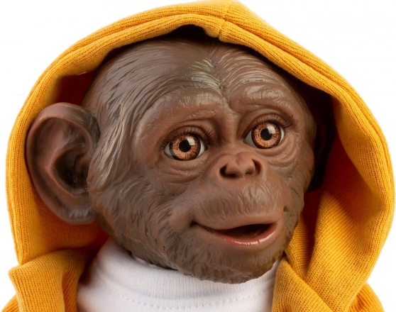 Małpka jest ubrana w modny żółty sweter i ma wyjątkowo realistyczne rysy twarzy, co dodaje jej autentycznego wyglądu prawdziwej małpy.