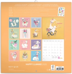 Kalendarz notesowy na rok 2025 z ilustracjami lam w różnych sytuacjach oferuje szerokie możliwości organizacji i zabawy.