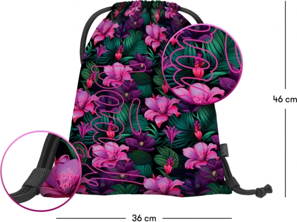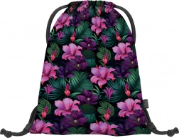 Worek PARADISE oferuje połączenie elegancji i praktyczności dzięki atrakcyjnemu kwiatowemu wzorowi z różowymi i fioletowymi kwiatami na ciemnym tle. Wykonany z wytrzymałego i zmywalnego materiału, co zapewnia długą żywotność i łatwą konserwację. Jego przestronne wnętrze jest idealne do przechowywania obuwia, książek lub innych przedmiotów.