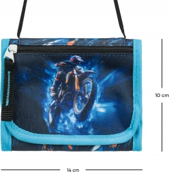 Ten lekki i kompaktowy portfel na szyję z atrakcyjnym motocyklowym designem jest idealny dla dzieci i nastolatków. Wytrzymałe tekstylne wykonanie sprawdza się w codziennym użytkowaniu i chroni zawartość w drodze do szkoły, na zajęcia i wycieczki.