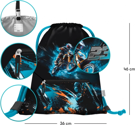 Worek BAAGL Motocykl łączy stylowy sportowy design z maksymalną funkcjonalnością. Wykonany jest z mocnego, łatwego do czyszczenia materiału, który wytrzymuje codzienne użytkowanie na treningu, w szkole i w podróży. Sznurki ściągające pełnią jednocześnie funkcję szelek, dzięki czemu worek wygodnie nosi się na plecach.