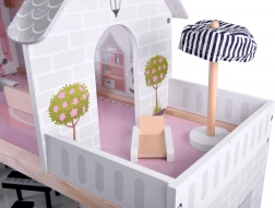 Domek jest wyposażony w taśmę LED zapewniającą przyjemne światło ambientowe w każdym pomieszczeniu. Otwarta konstrukcja, okna oraz dekorowana fasada z kwiatami i lampami nadają realistyczny charakter. W zestawie znajduje się szeroki wybór drewnianych mebli: od stołu jadalnianego, fotelików i sofy, przez wyposażenie łazienki, aż po czarne pianino z taboretem oraz leżak z parasolem na taras.