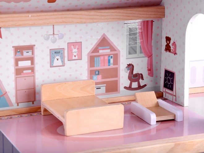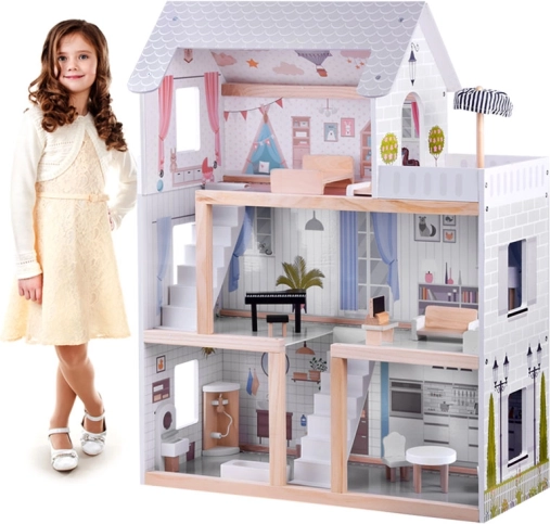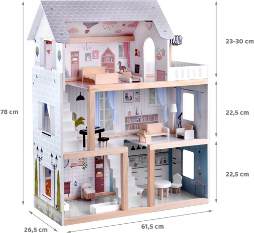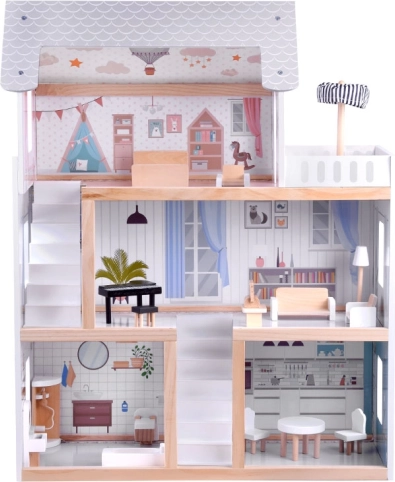 Ten drewniany domek dla lalek został zaprojektowany, by inspirować dzieci do twórczej zabawy i opowiadania historii. Oferuje parter z kuchnią i łazienką, pierwsze piętro z salonem i czytelnią z kącikiem dla miłośników muzyki oraz poddasze z uroczym dziecięcym pokoikiem i dużym tarasem. Delikatna estetyka boho, ilustracje i drewniane elementy działają kojąco.