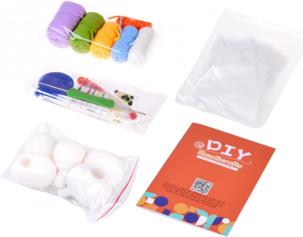 6× motek włóczki (ecru, niebieska, żółta, zielona, fioletowa, pomarańczowa); 5× gumowy balonik do wypełnienia; wypełnienie (wata); szydełko 2,5 mm; bezpieczne nożyczki; 2× bezpieczna igła; samoprzylepne oczka; 10× agrafka/marker; miarka zwijana; klej na gorąco w sztyfcie; ilustrowana instrukcja (EN)