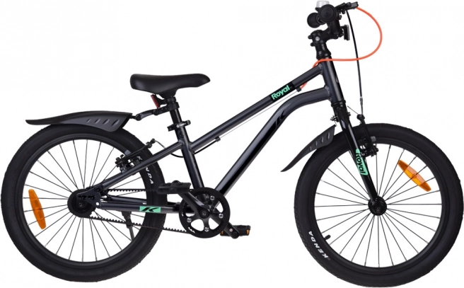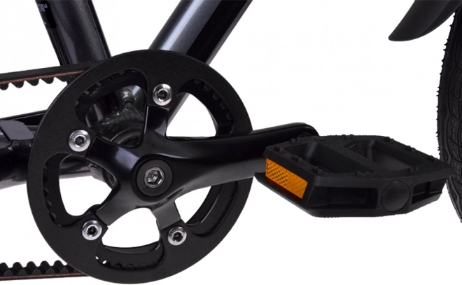 Ergonomiczna kierownica z miękkimi chwytami i dzwonkiem, skuteczne hamulce V‑brake oraz pełny zestaw odblasków dla lepszej widoczności.