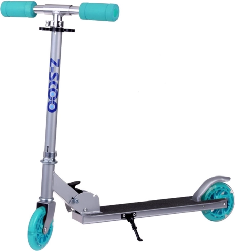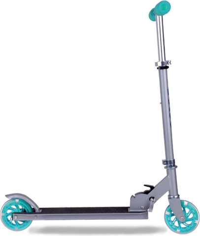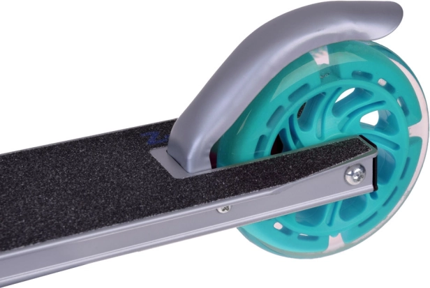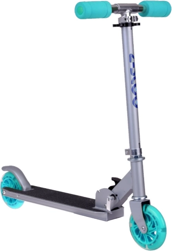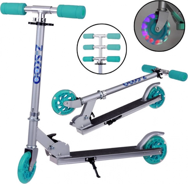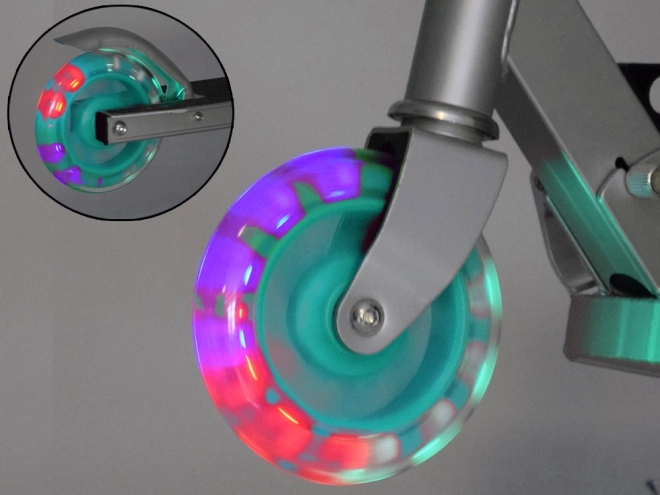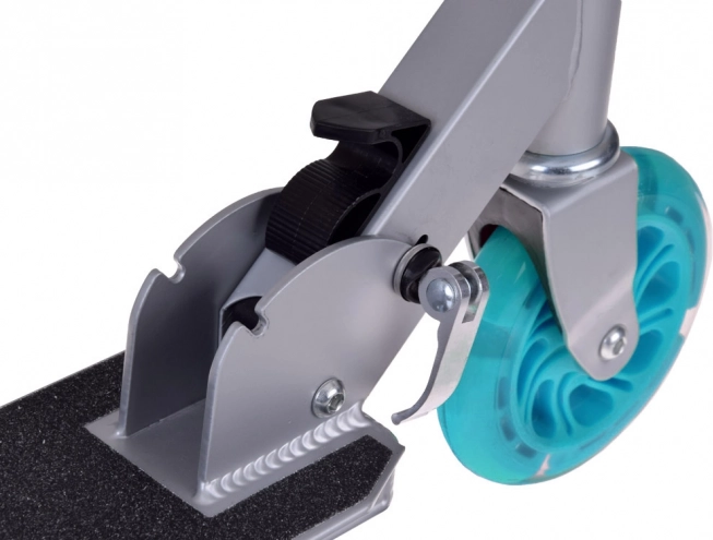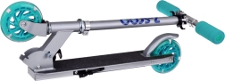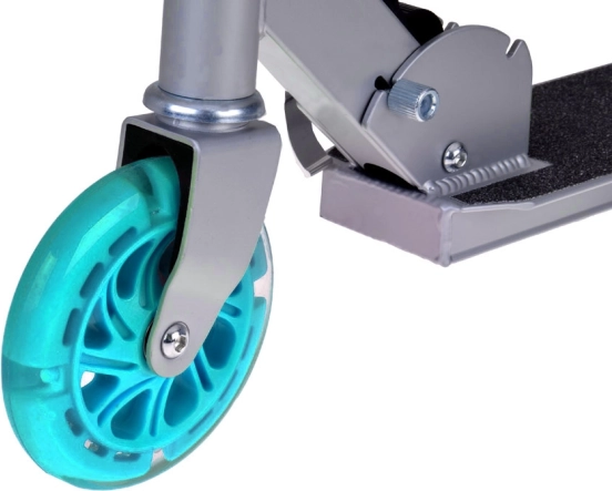 Ta składana dziecięca hulajnoga łączy niską wagę, solidną metalową konstrukcję i radosny design z turkusowymi akcentami. Dzięki kółkom LED, które świecą podczas jazdy i nie wymagają baterii, dziecko jest lepiej widoczne, a każda przejażdżka to jeszcze większa frajda.