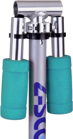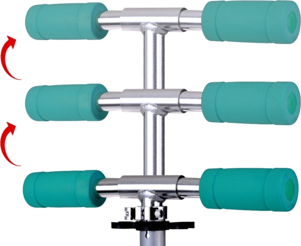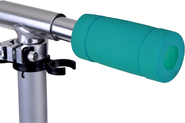 Teleskopowy drążek z kilkoma poziomami wysokości rośnie razem z dzieckiem. Miękkie piankowe chwyty zapewniają pewny i komfortowy uchwyt.