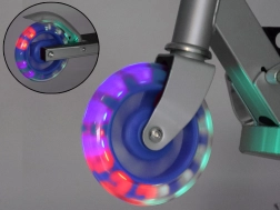 Ta dziecięca hulajnoga łączy lekkość, składaną konstrukcję i bezpieczne wykonanie. Świecące koła LED zwiększają widoczność i atrakcyjność podczas jazdy, bez potrzeby baterii – diody zasilane są energią generowaną podczas obrotu kół.