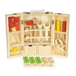 Skrzynka zawiera specjalne przegrody i uchylaną ściankę z uchwytami na narzędzia, co zapewnia łatwy dostęp i porządek. Dzięki szerokiej gamie komponentów Twoje dziecko może budować proste konstrukcje i doskonalić umiejętności takie jak pisanie, rysowanie czy ubieranie się.