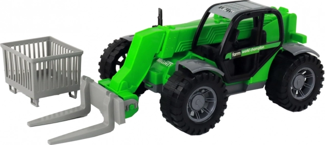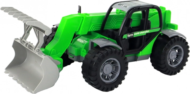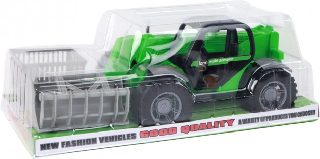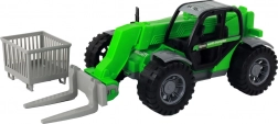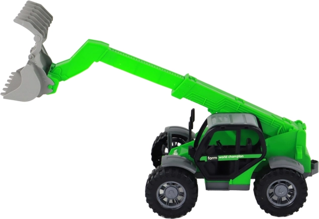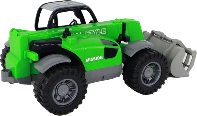 W zestawie znajdują się trzy łatwo wymienialne nasadki: widły do bel i materiałów, kosz transportowy oraz chwytak do drewna lub gałęzi. Napęd frykcyjny umożliwia proste wprawienie w ruch – wystarczy popchnąć i jechać. Zabawa sprzętem budowlanym i rolniczym wspiera motorykę małą, koordynację oraz kreatywne myślenie.