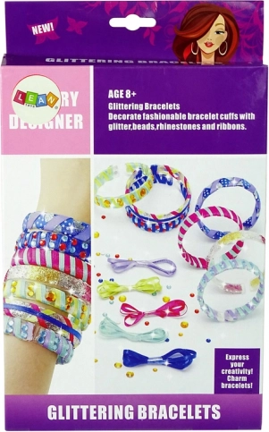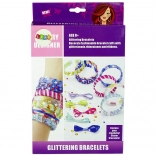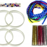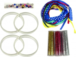 W opakowaniu znajdziesz: 4 przezroczyste bransoletki, 3 brokaty (złoty, srebrny, różowy) oraz wstążki w różnych kolorach. Zestaw jest zapakowany w ozdobne pudełko, dzięki czemu świetnie nadaje się na prezent. Polecany dla dzieci od 8 lat. Zawiera małe elementy.