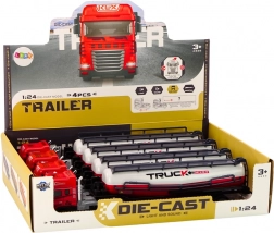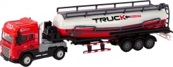 Realistyczny model ciężarówki z cysterną w skali 1:24 ucieszy małych kierowców i kolekcjonerów. Oferuje efekty świetlne i dźwiękowe po naciśnięciu kabiny, odczepianą przyczepę oraz samodzielny ruch modelu dla jeszcze zabawniejszej zabawy. Cysternowa naczepa ma wymiary 38 × 7 × 7 cm. Zabawka jest odpowiednia dla dzieci od 3 lat i spełnia normy CE oraz EN71. Cena dotyczy 1 sztuki.