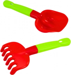 W zestawie znajdują się łopatka i grabki, które wspierają aktywność fizyczną oraz motorykę małą dzieci podczas zabawy w piasku lub ziemi.