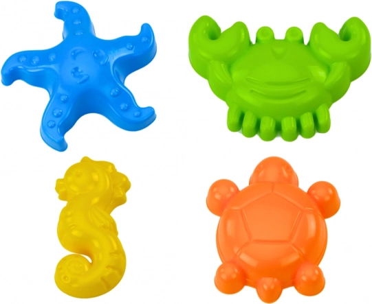 Cztery foremki w kształcie morskich stworzeń pozwalają dzieciom tworzyć różnorodne piaskowe rzeźby i jednocześnie uczyć się o życiu morskim.