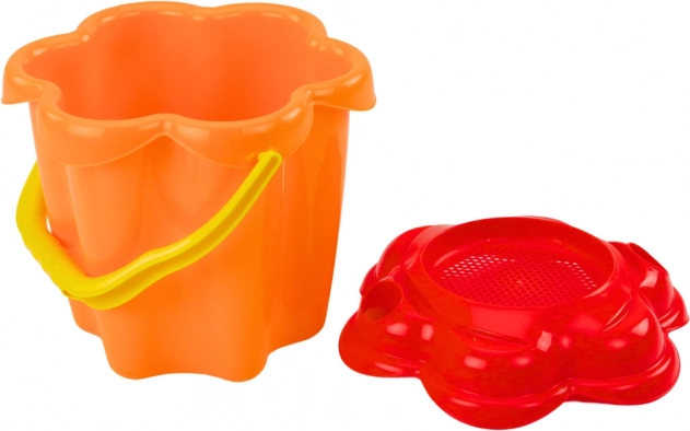 Wiaderko jest wyposażone w pokrywkę w kształcie kwiatka, które służy jako sitko na piasek, co dodaje dodatkowy wymiar przy zabawach w piasku.