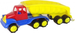 Duża żółta ciężarówka z przyczepą to zabawka, która rozwija dziecięcą kreatywność i zabawę. Dzięki swojej długości i obrotowej przyczepie umożliwia szeroki wachlarz scenariuszy zabaw.