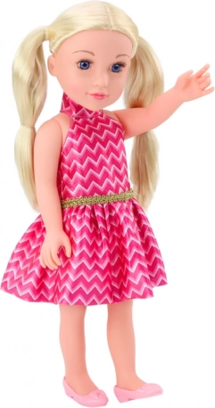 Ta piękna lalka ma długie, blond włosy upięte w kucyki, co dodaje jej dziecięcego uroku. Włosy są miękkie i łatwe do stylizacji, co pozwala na kreatywne zabawy fryzjerskie. Lalka ma delikatny makijaż i długie rzęsy, które podkreślają wyraziste rysy jej twarzy. Jest ubrana w różową sukienkę ze złotym paskiem, idealnie dopasowaną do różowych butów.