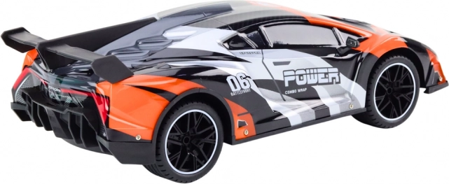 Szaro‑pomarańczowe sportowe nadwozie z wyścigowymi elementami, napisami i tylnym skrzydłem nadaje modelowi realistyczny charakter.